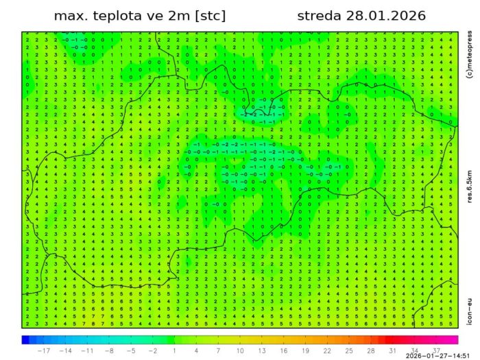 Maximá dosiahnu prevažne od -1, v centrálnej časti Slovenska, po 6 °C v oblasti Hornej Nitry.