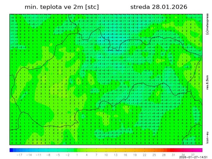 Obr. 2: Predpoveď minimálnej teploty v 2 m podľa modelu ICON.
