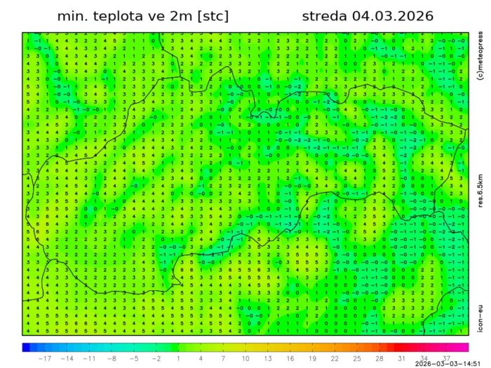Obr. 4: Predpokladaná minimálna teplota vzduchu v stredu (4. 3.) podľa modelu ICON-EU