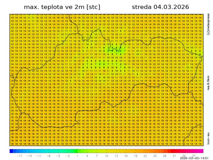Obr. 5: Predpokladaná maximálna teplota vzduchu v stredu (4. 3.) podľa modelu ICON-EU