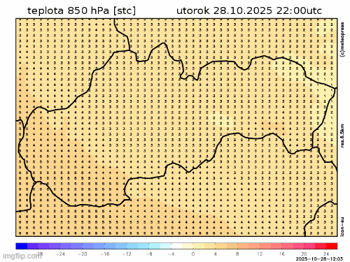Obr. 3: Predpoveď teploty vo výške 850 hPa podľa modelu ICON.