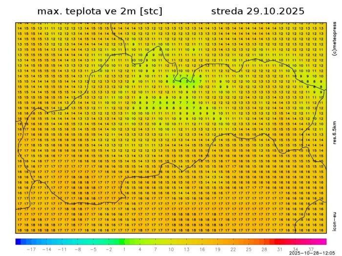 V priebehu dňa sa teplejšie prúdenie prejaví na vyššej maximálnej dennej teplote. Na juhu by mala stúpať k 18 °C. Na severe a pri veľkej oblačnosti bude okolo 12 °C.