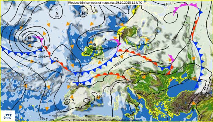 Obr. 1: Predpoveď synoptickej situácie na stredu, 29. októbra. Zdroj: ČHMÚ