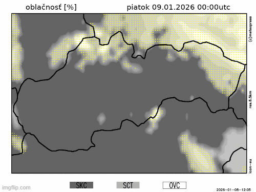 Obr. 1: Predpokladaný vývoj oblačnosti na Slovensku v piatok (9. 1.) podľa modelu ICON