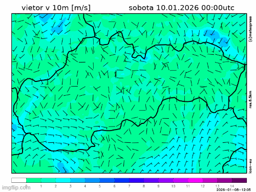 Obr. 5: Predpokladaný vývoj smeru a rýchlosti vetra na Slovensku v sobotu (10. 1.) podľa modelu ICON