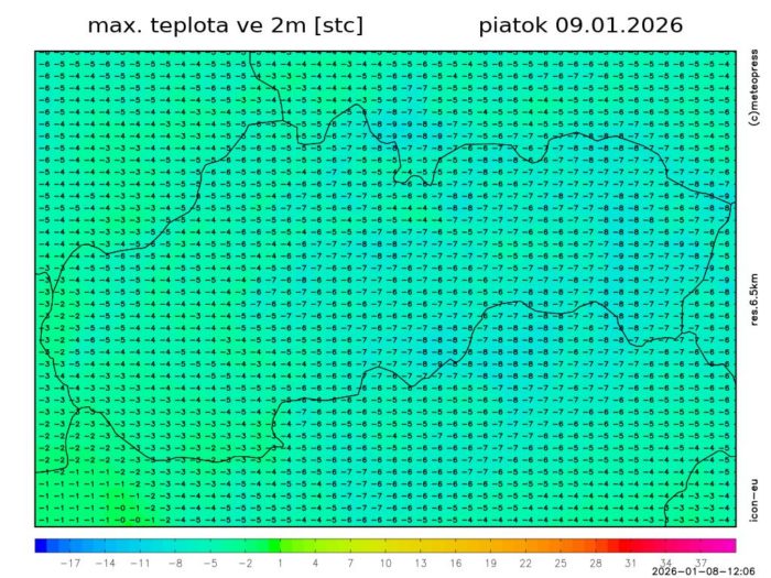 Obr. 4: Predpokladané maximálne teploty vzduchu v piatok (9. 1.) podľa modelu ICON