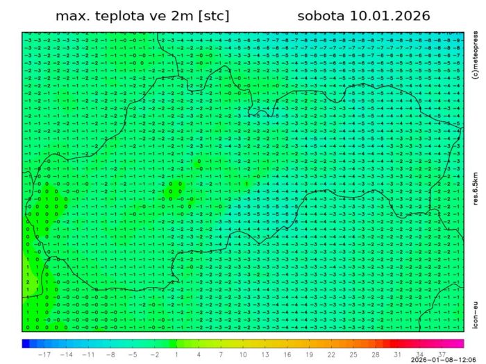 Obr. 7: Predpokladané maximálne teploty vzduchu v sobotu (10. 1.) podľa modelu ICON