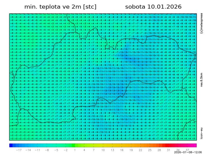 Obr. 6: Predpokladané minimálne teploty vzduchu v sobotu (10. 1.) podľa modelu ICON