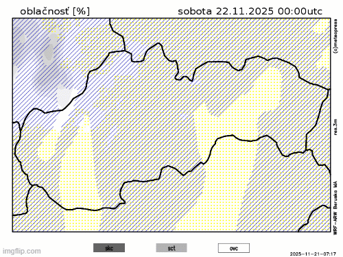 Obr. 2: Predpokladaný vývoj oblačnosti na Slovensku v sobotu (22. 11.) podľa modelu WRF