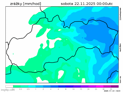 Obr. 3: Predpokladaný vývoj zrážkovej aktivity na Slovensku v sobotu (22. 11.) podľa modelu ICON