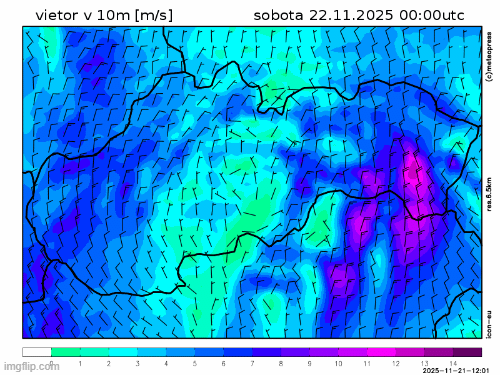Obr. 4: Predpokladaný vývoj smeru a rýchlosti vetra na Slovensku v sobotu (22. 11.) podľa modelu ICON