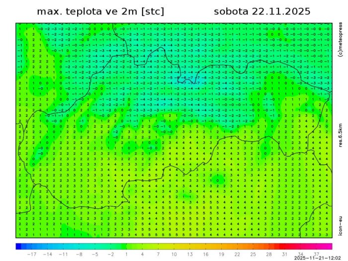 Obr. 6: Predpokladané maximálne teploty vzduchu v sobotu (22. 11.) podľa modelu ICON