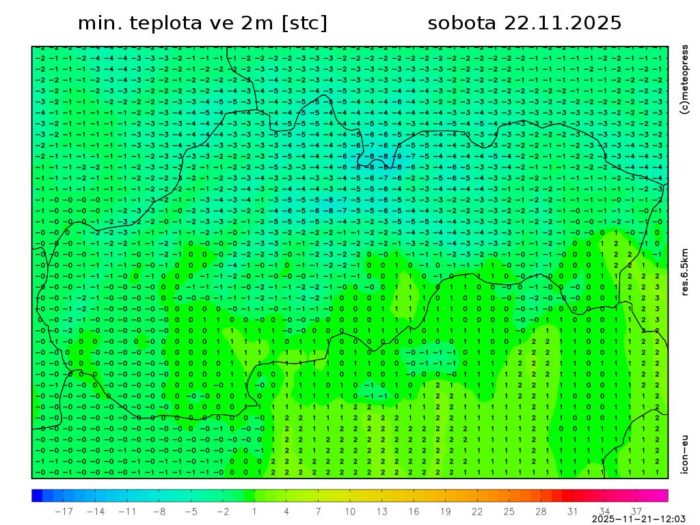Obr. 5: Predpokladané minimálne teploty vzduchu v sobotu (22. 11.) podľa modelu ICON