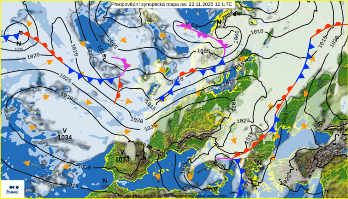 Obr.1: Synoptická situácia – sobota (22. 11.)