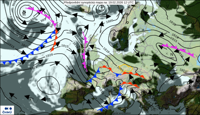 Obr. 1: Predpoveď synoptickej situácie na štvrtok, 19. februára. Zdroj: ČHMÚ