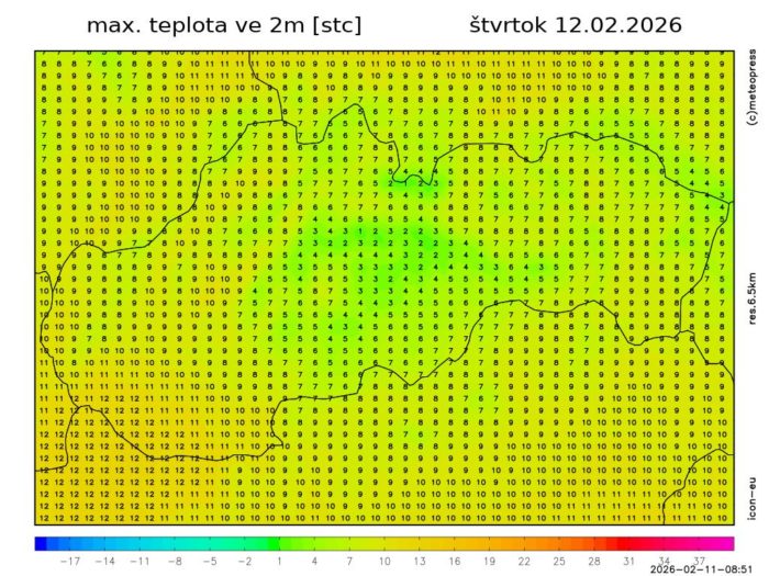 Obr. 4 Maximálna denná teplota podľa modelu ICON-EU.
