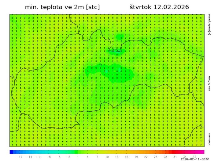 Obr. 3 Minimálna nočná teplota podľa modelu ICON-EU.