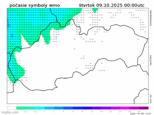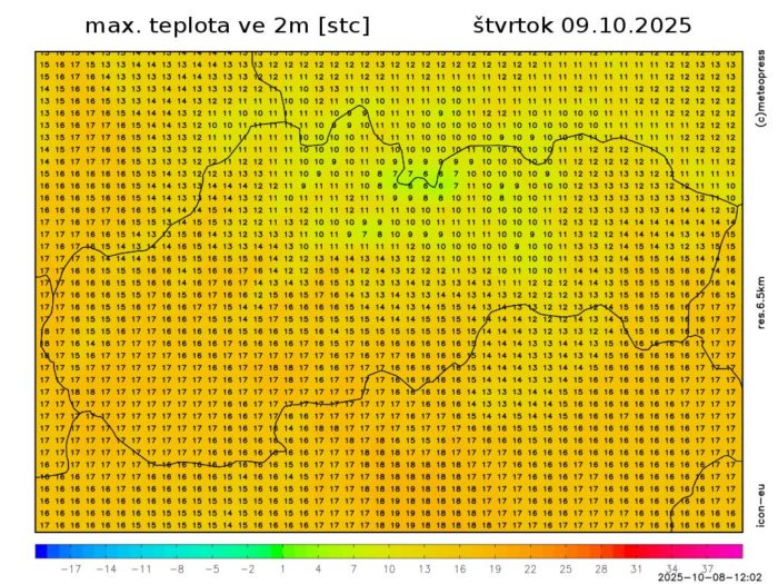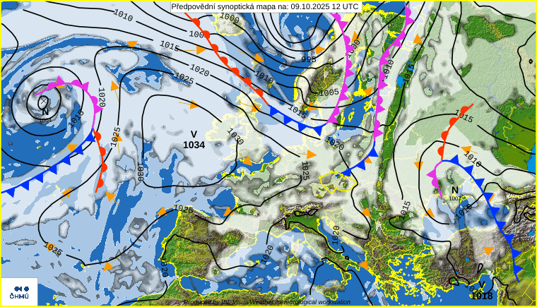 Obr. 1 Synoptická analýza na štvrtok 9.10.2025. Zdroj: ČHMÚ.
