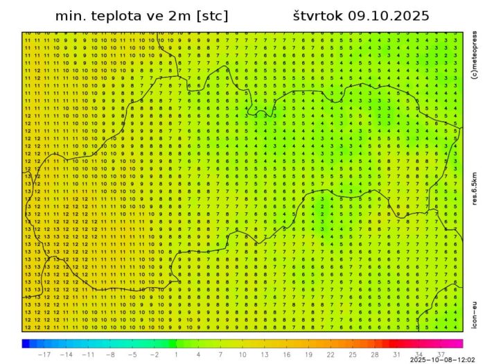 Obr. 3 Minimálna nočná teplota podľa modelu ICON-EU.