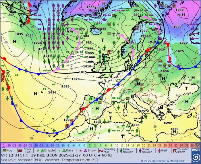 Obr. 1 Synoptická analýza na piatok 19.12.2025. Zdroj: DWD.de