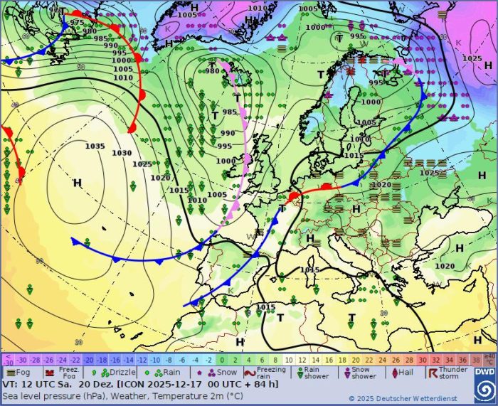 Obr. 5 Synoptická analýza na sobotu 20.12.2025. Zdroj: DWD.de