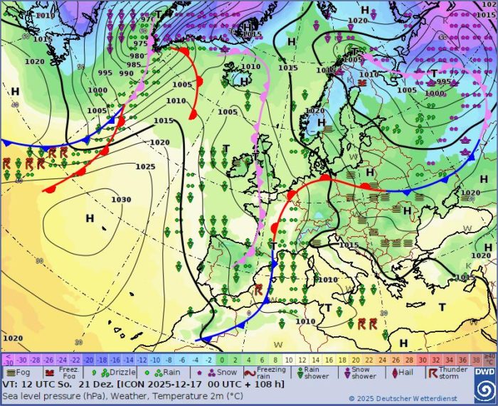 Obr. 9 Synoptická analýza na nedeľu 21.12.2025. Zdroj: DWD.de
