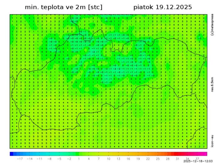 Nočná teplota 4 až -1, v údoliach ojedinele -3 °C.