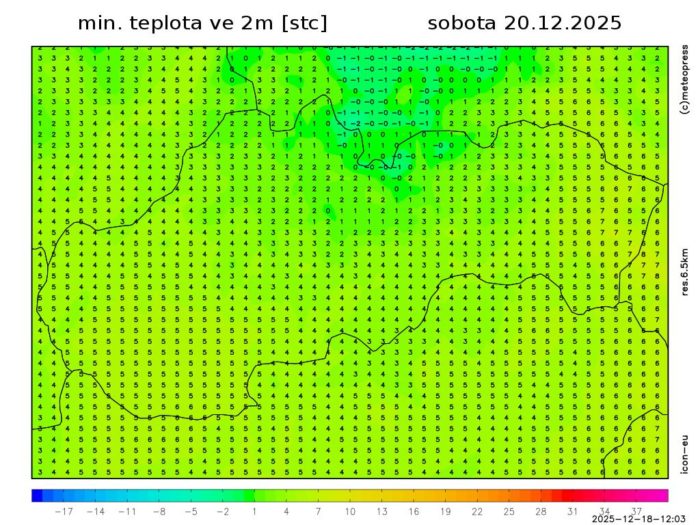 Obr. 7 Minimálna nočná teplota podľa modelu ICON-EU.