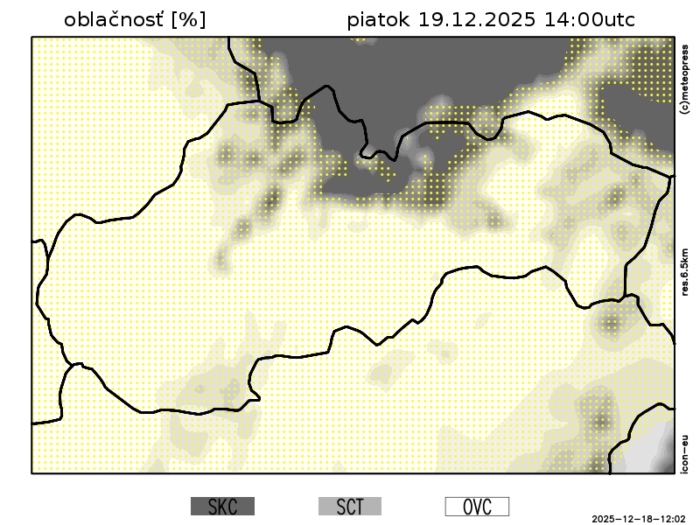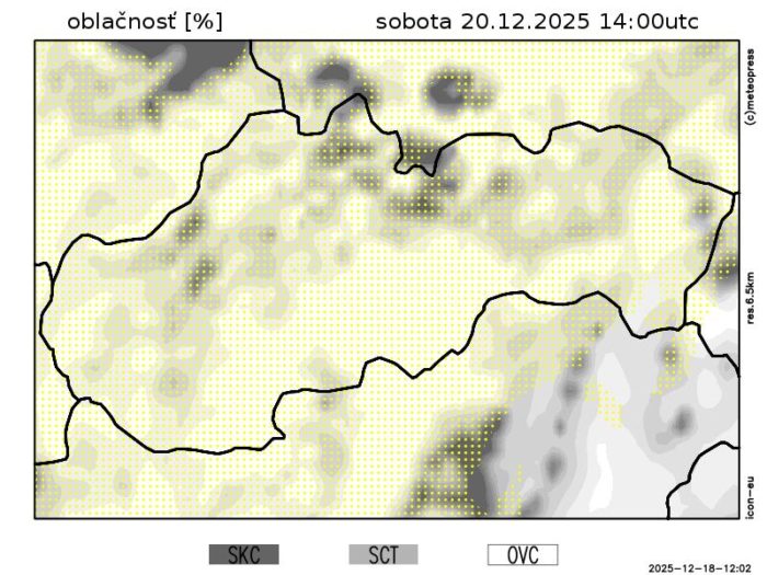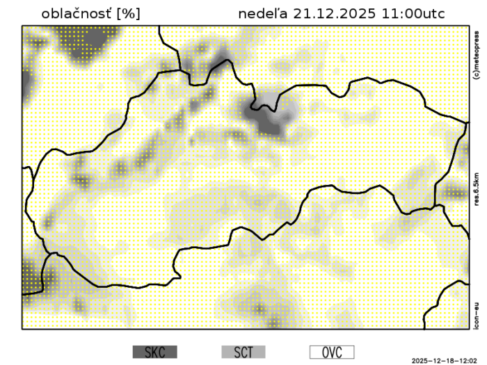 Prevažne zamračené, lokálne hmlisto. Spočiatku ojedinele, postupne miestami zmenšená oblačnosť. Ojedinele zrážky, od stredných polôh, v závere na severe aj v nižších polohách, sneženie.