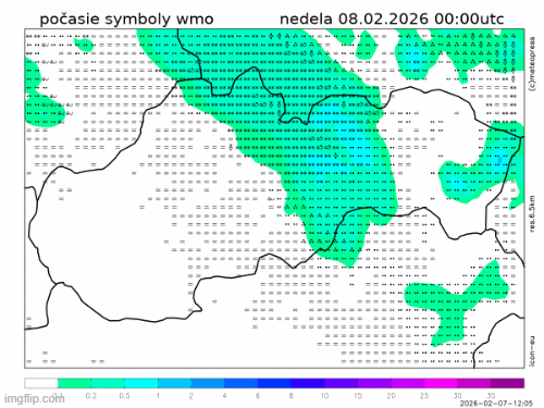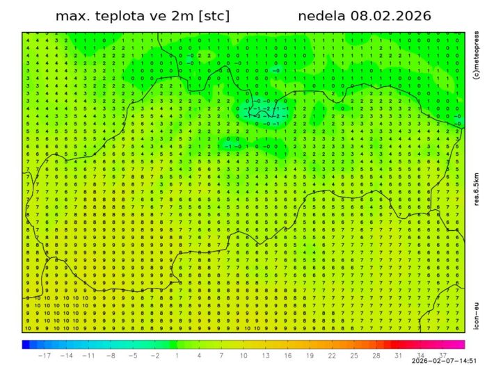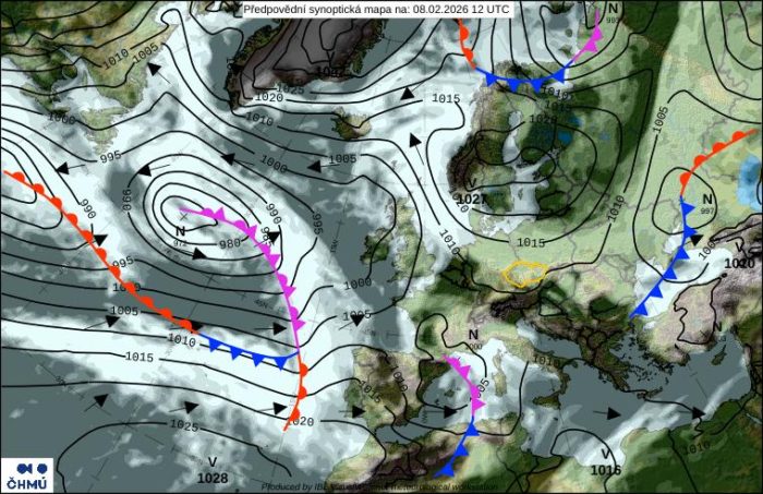 Obr. 1 Synoptická analýza na nedeľu 8.2.2026. Zdroj: ČHMÚ.