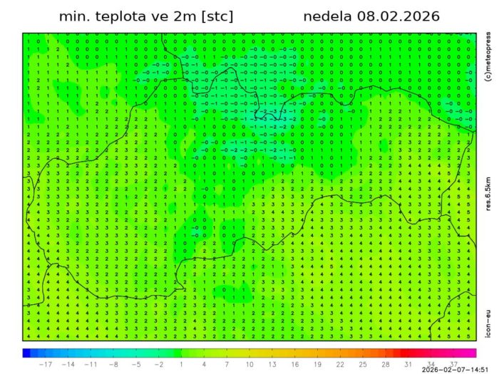 Obr. 3 Minimálna nočná teplota podľa modelu ICON-EU.
