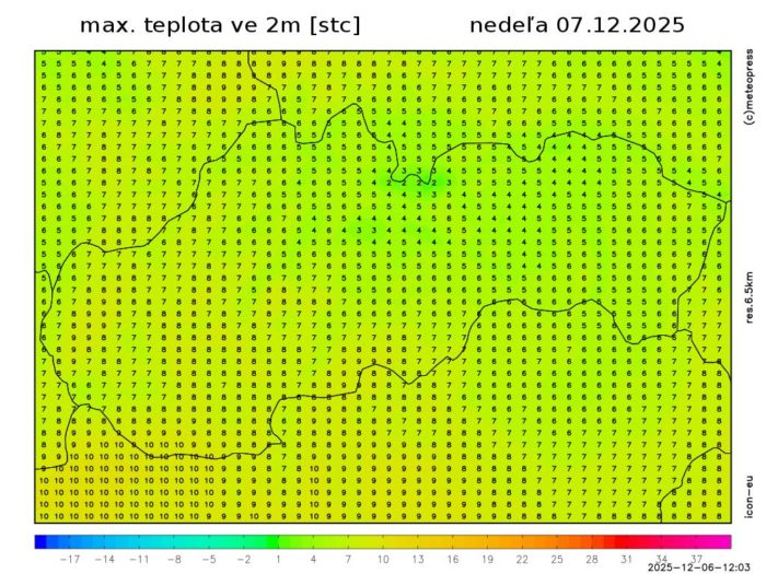 Obr. 4 Maximálna denná teplota podľa modelu ICON-EU.