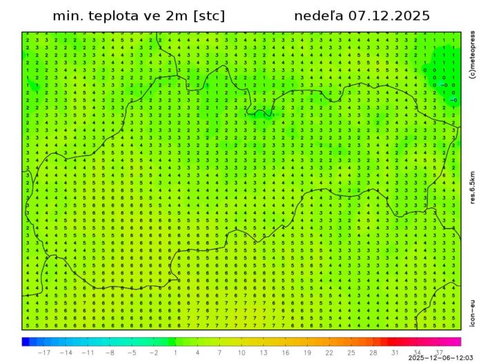 Obr. 3 Minimálna nočná teplota podľa modelu ICON-EU.