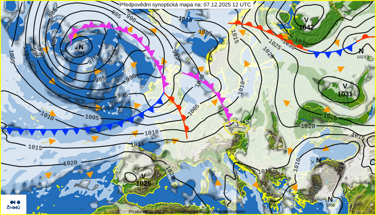 Obr. 1 Synoptická analýza na nedeľu 7.12.2025. Zdroj: ČHMÚ.